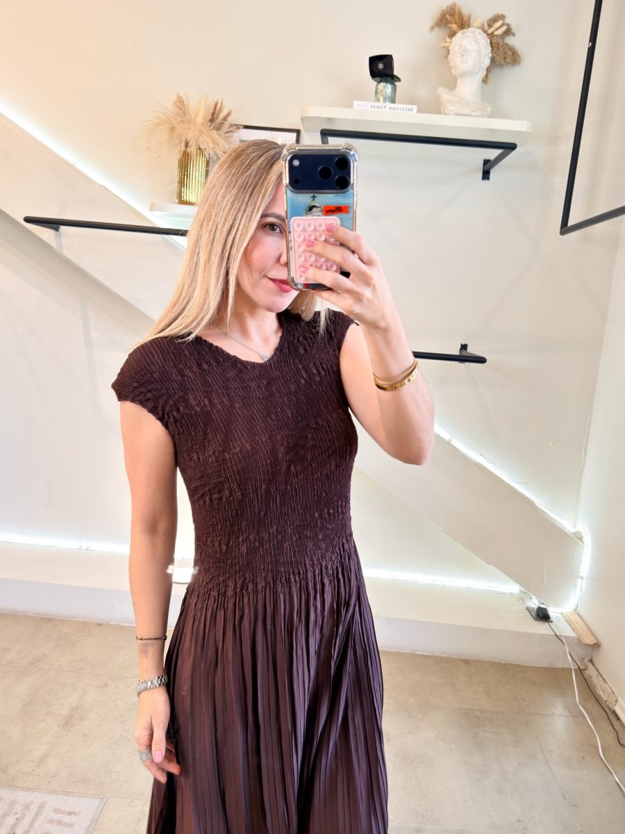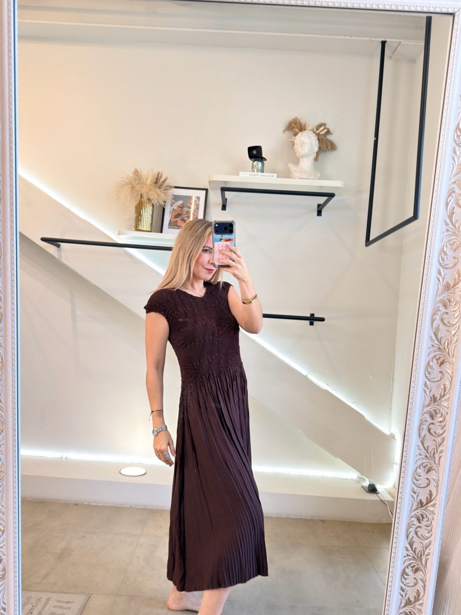 Vestido Brown con efecto plisado en la parte de arriba y efecto falda liso