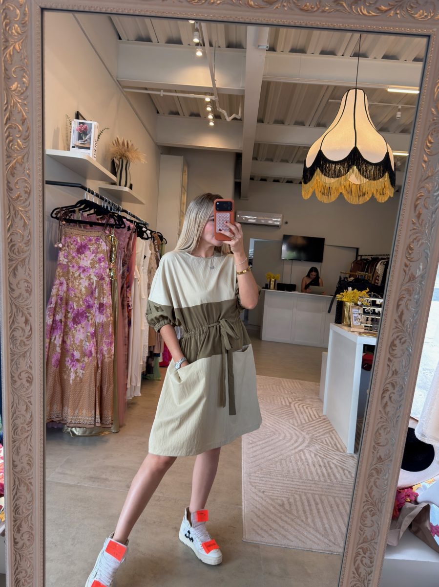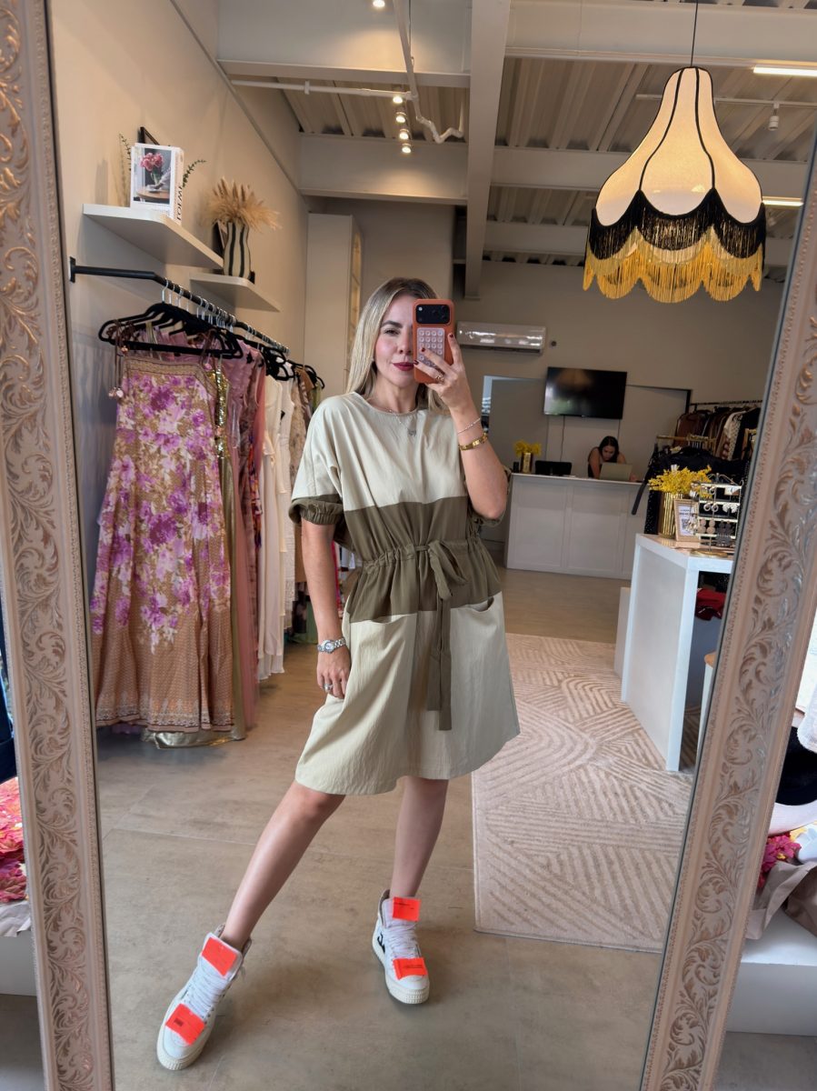Vestido color verde pastel con verde olivo, cuello redondo y bolsas delanteras. Ajuste en cintura y cierre en la parte de atrás.