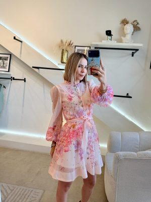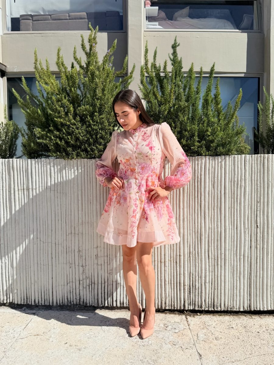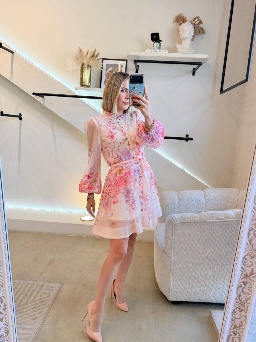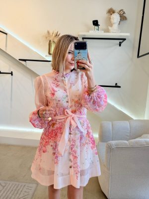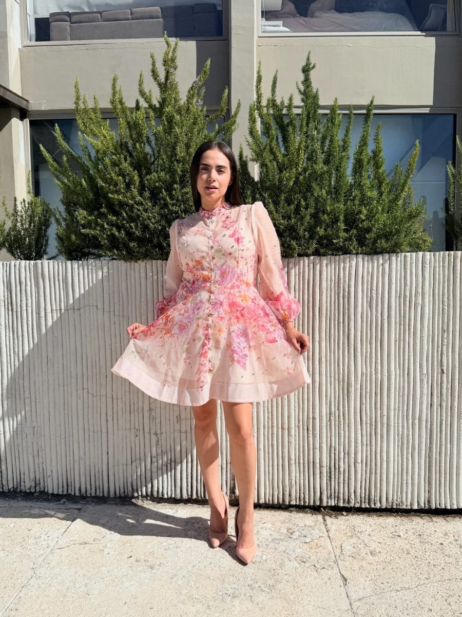 Vestido corto manga larga con brillos ,estampado flores de colores y botones diferentes