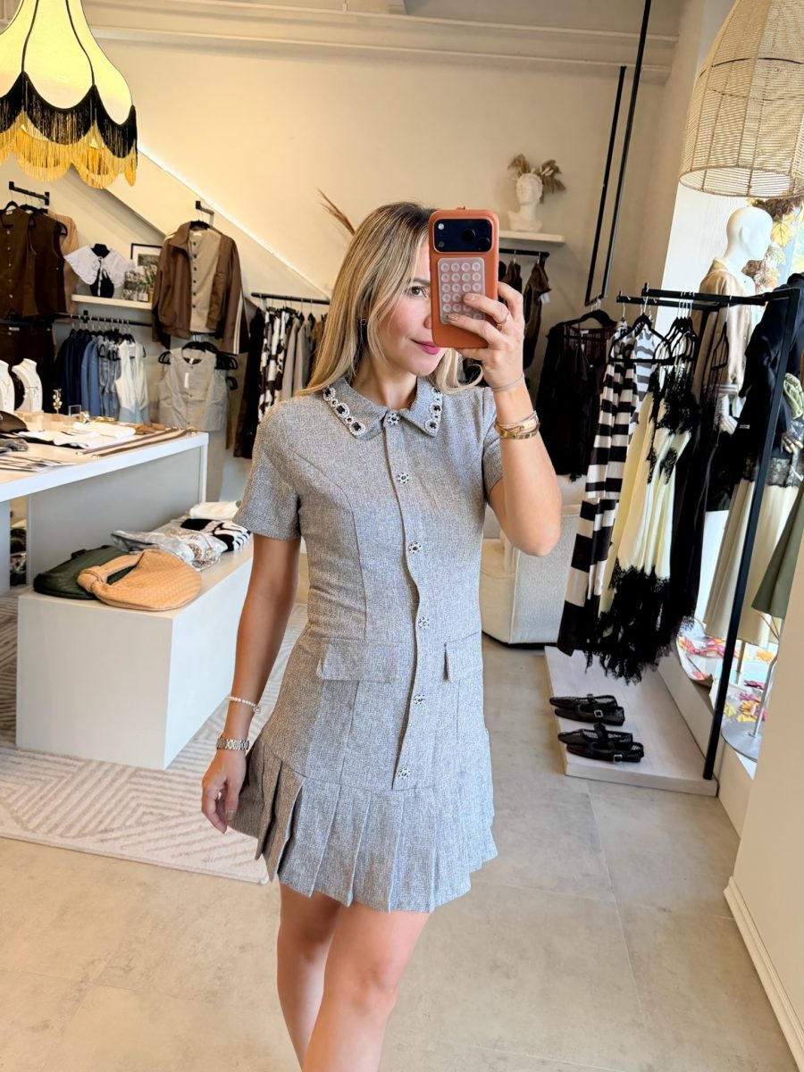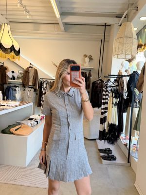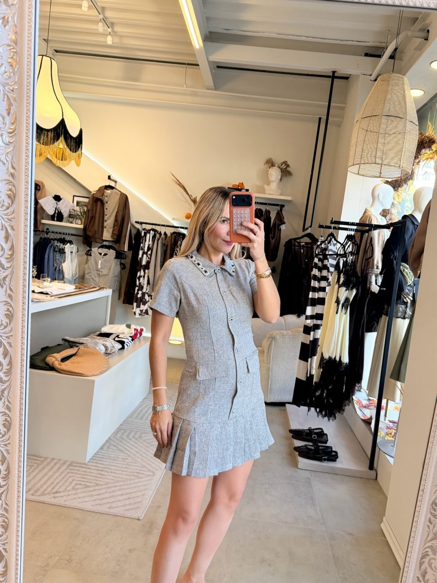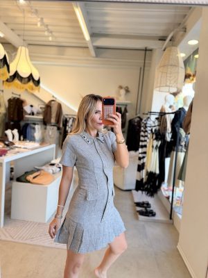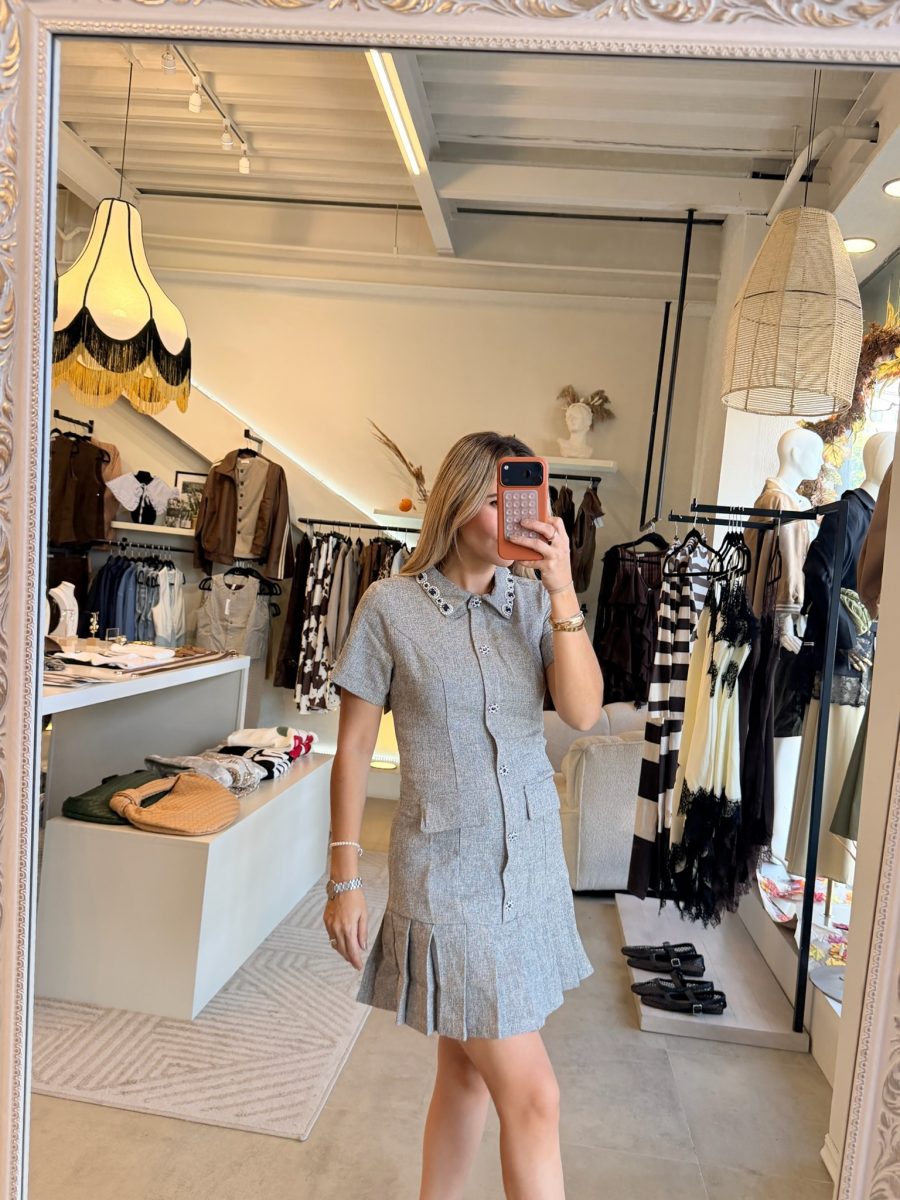 Vestido gris, manga corta, cuello tipo polo con aplicaciones, cierre en la parte de atrás y botones con aplicaciones en la parte de enfrente.