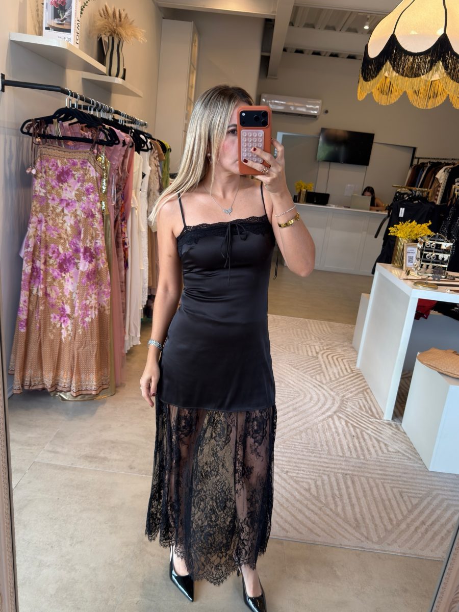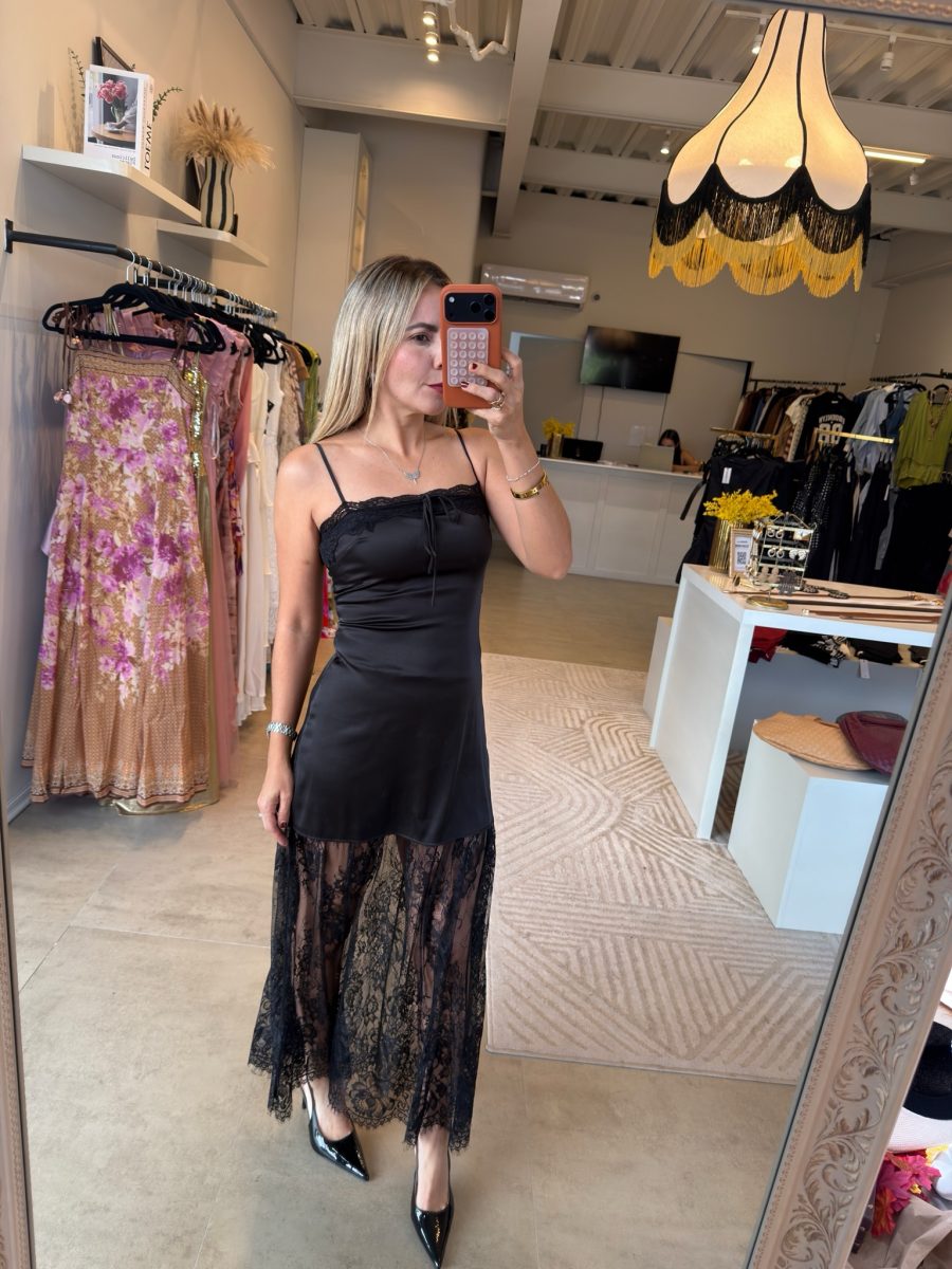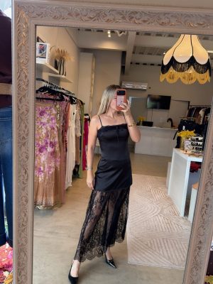 Vestido tirante telas combinadas satin y encaje color negro cierre en espalda