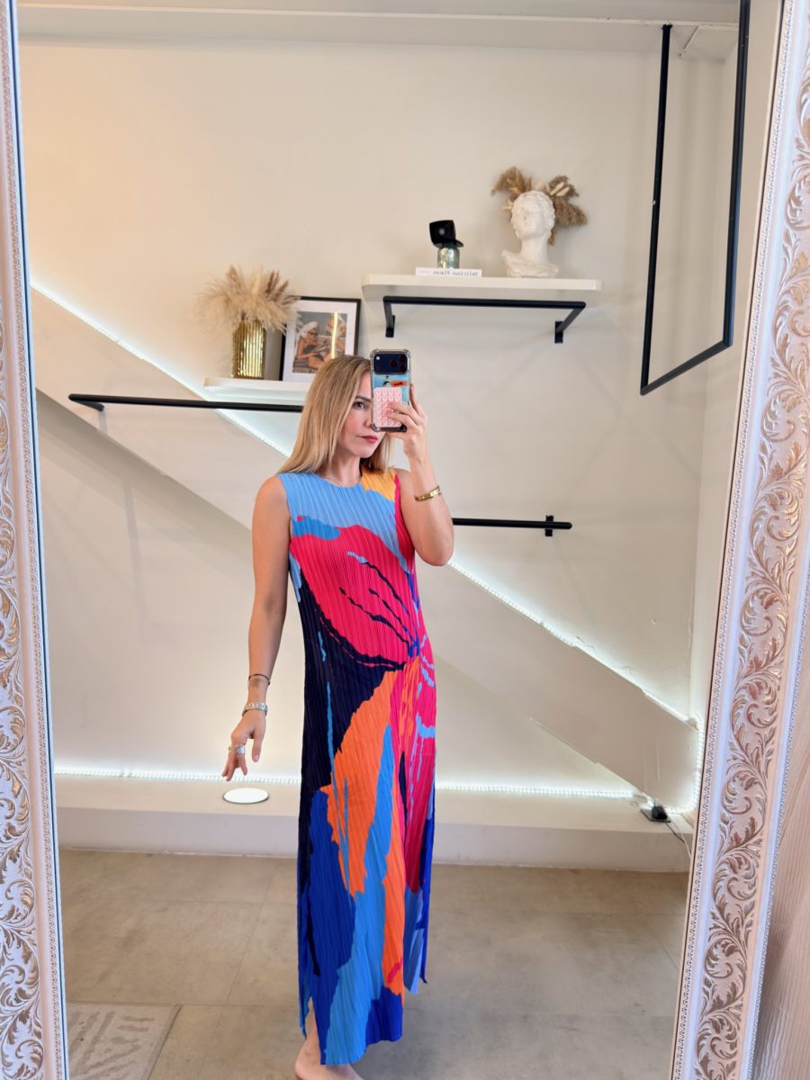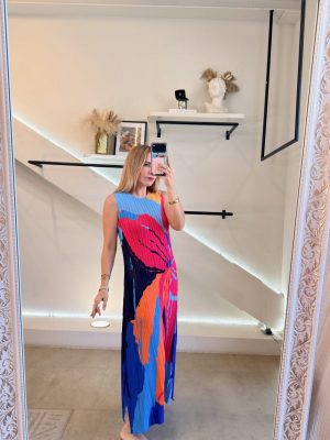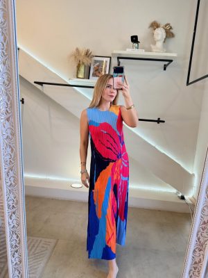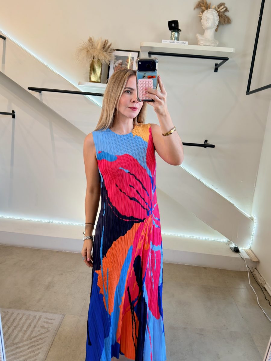 Vestido español efecto plisado colorido. Color azul y diseño de flor con color rosa, naranja y azul marino