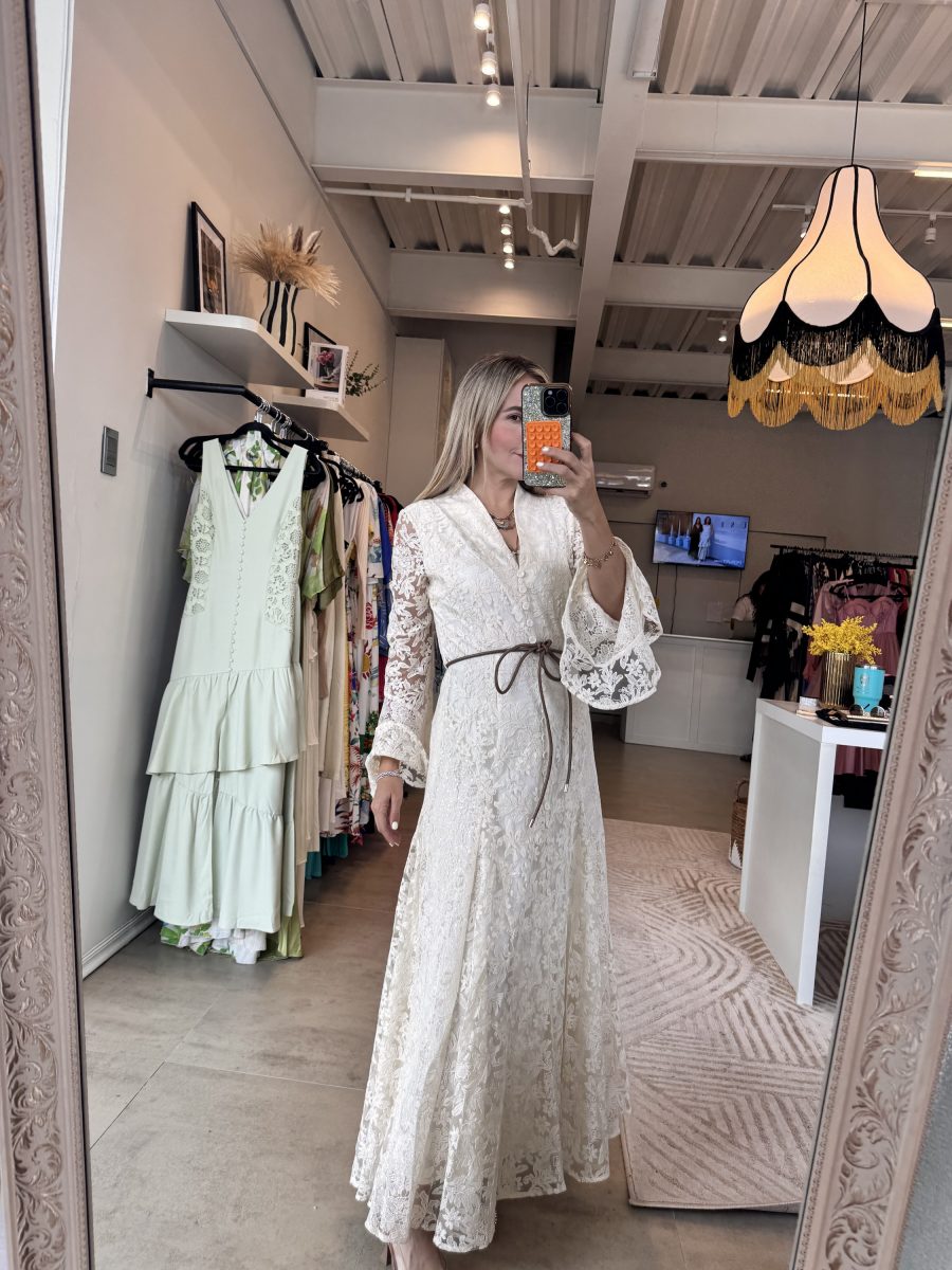 Vestido manga larga con cinturón y encaje color ivory con aplicaciones de lentejuela