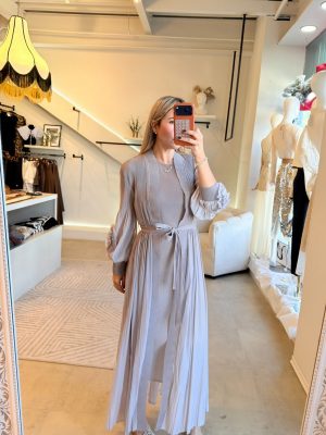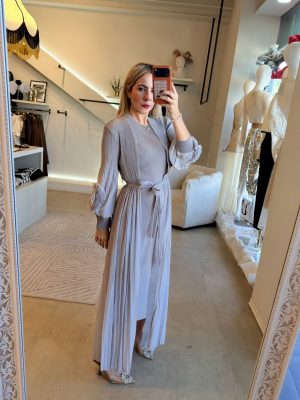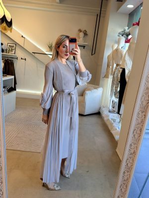 Vestido plisado con ensamble color arena y aplicación de flor en manga larga