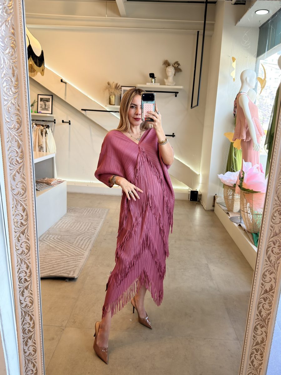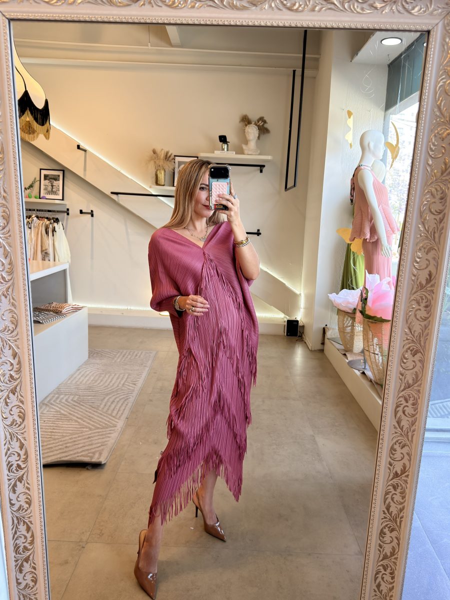 Vestido escote V tela plisada con flecos color rosa
