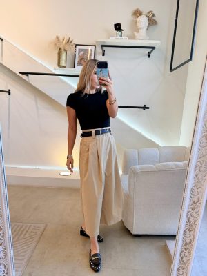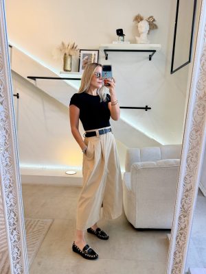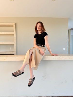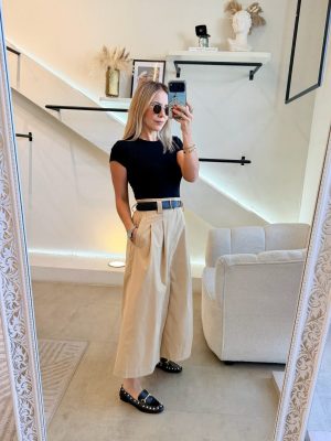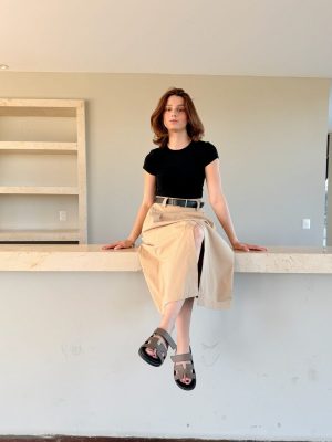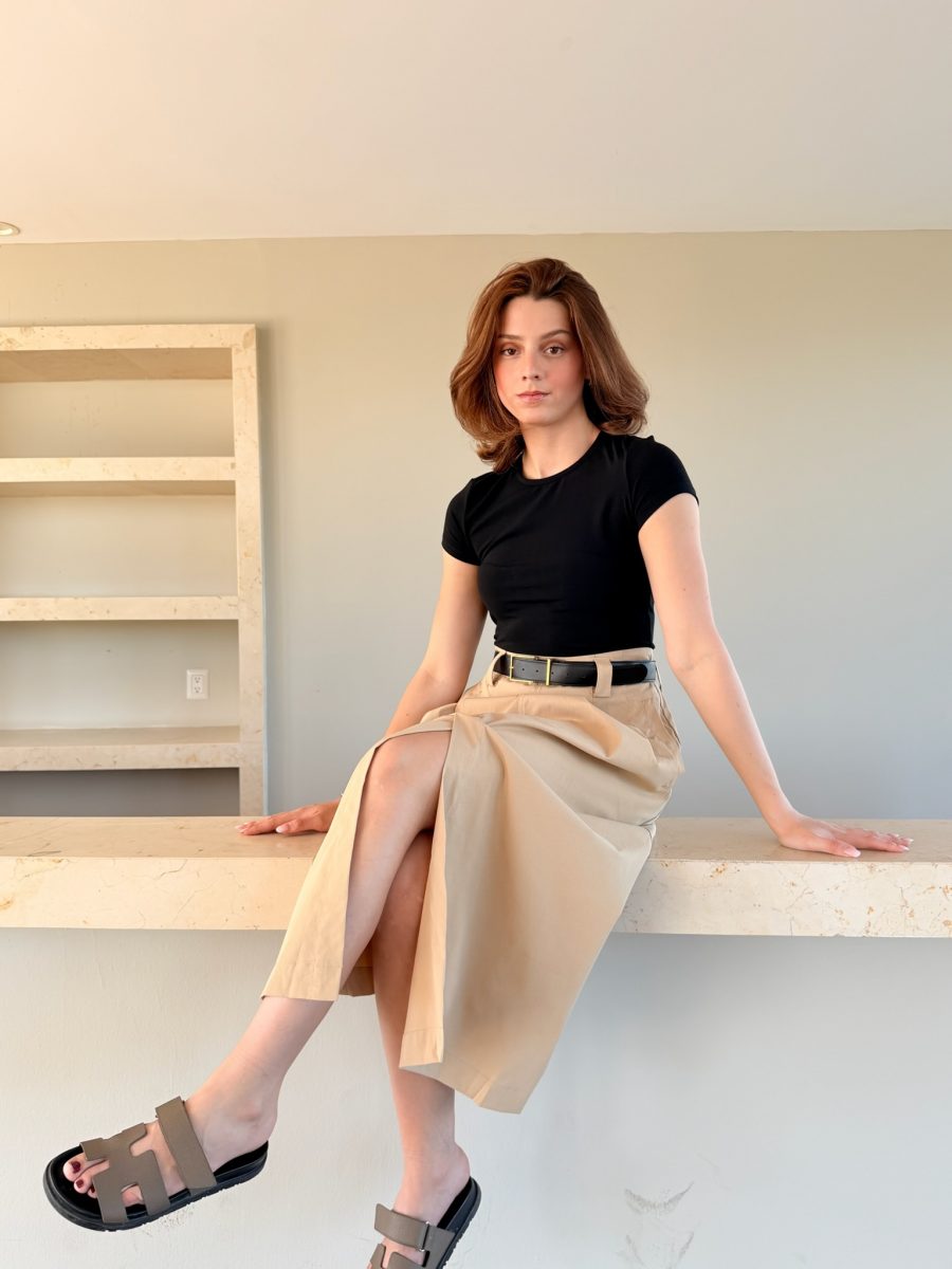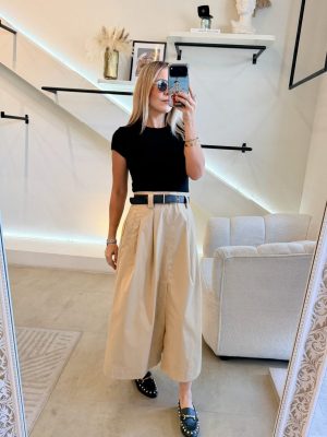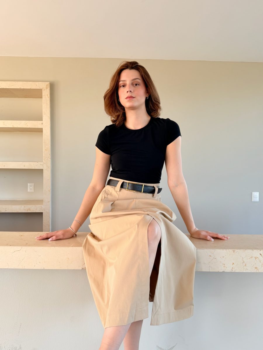 Vestido falda color beige con cinto color negro