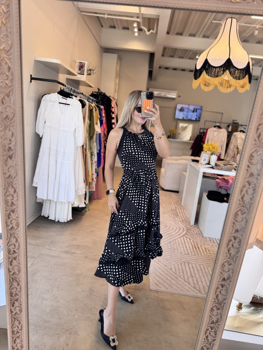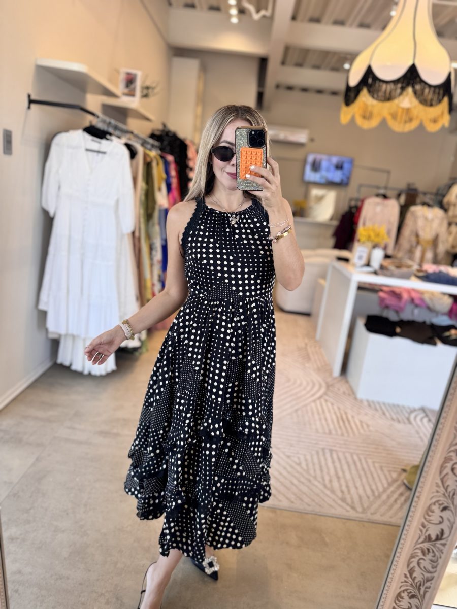Vestido largo cuello halter color negro con estampado de lunares color blanco
