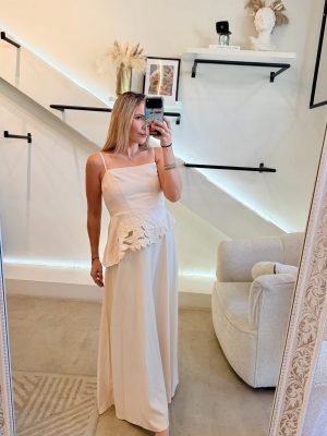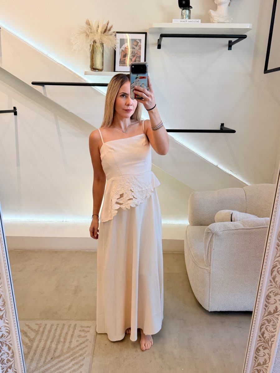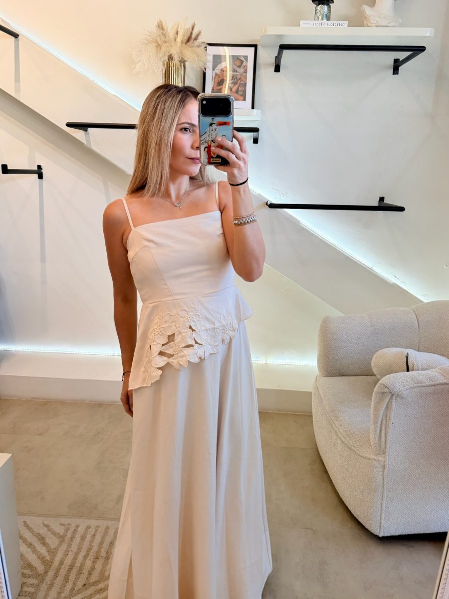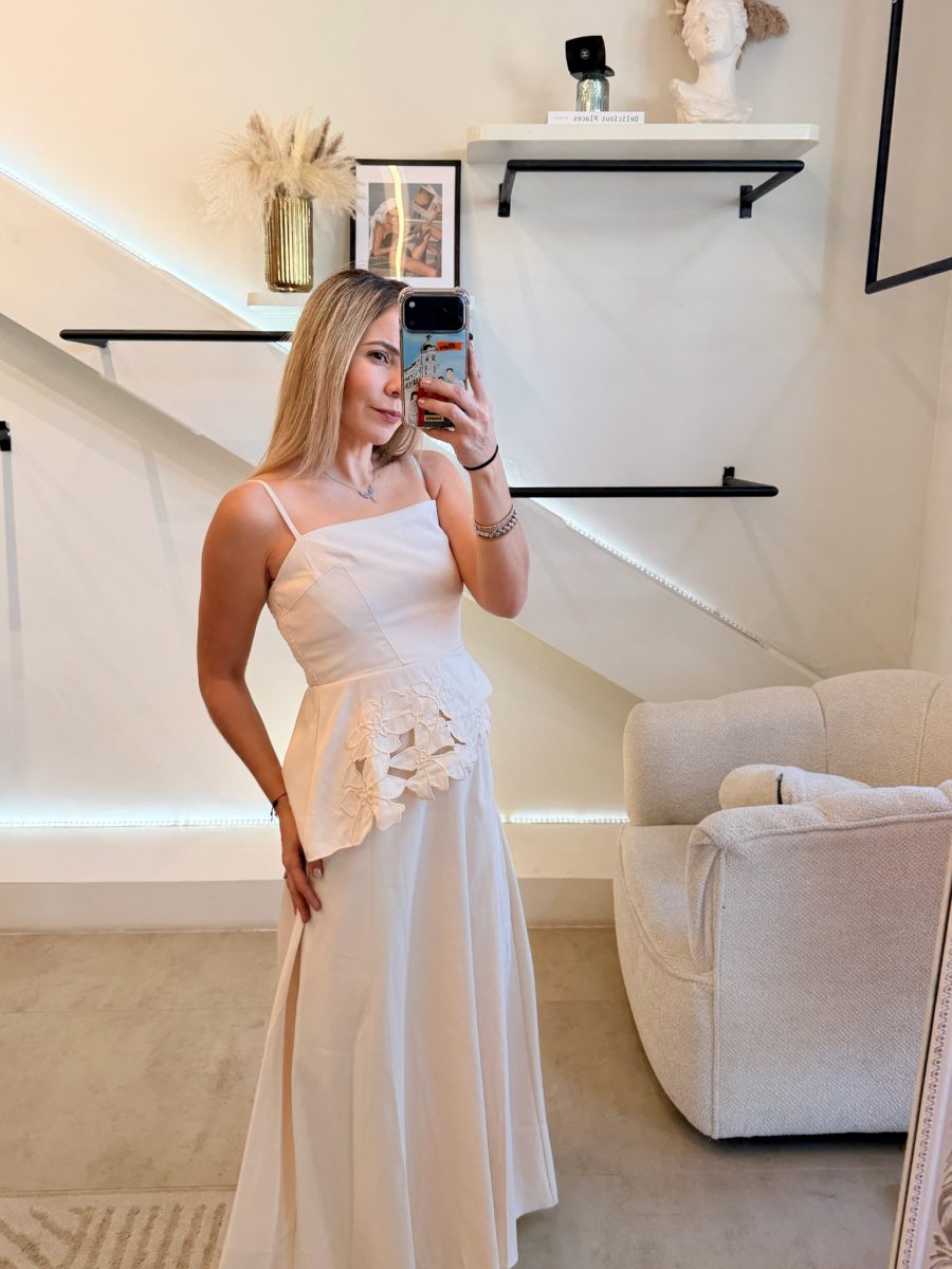 Vestido largo tirantes color beige con aplicaci0nes de flores al frente