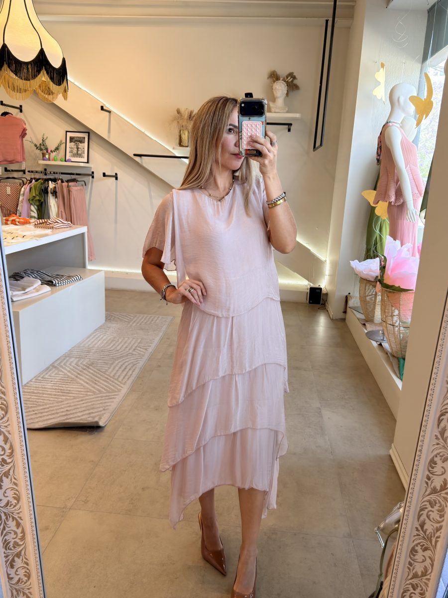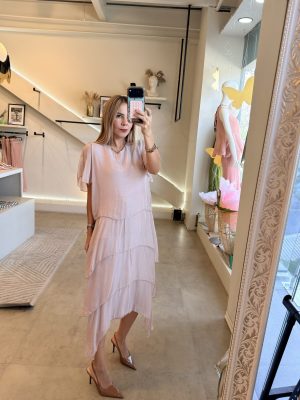 Vestido largo midi color rosa pastel con diseño de Olanes. Tela fresca tipo seda