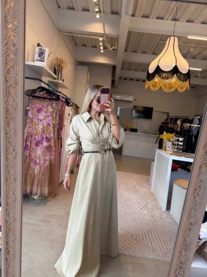 Vestido largo color taupe con cinto cinto negro, hebilla dorada, botones enfrente y cierre en la parte de atrás.