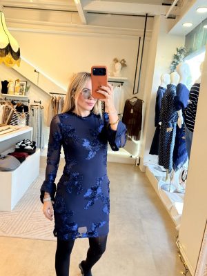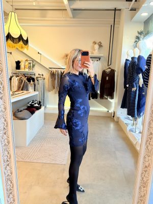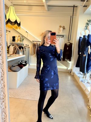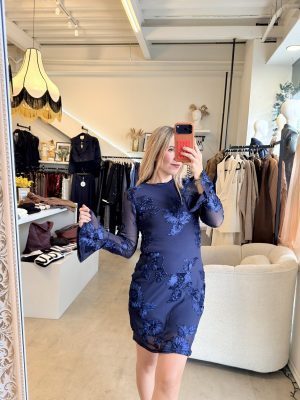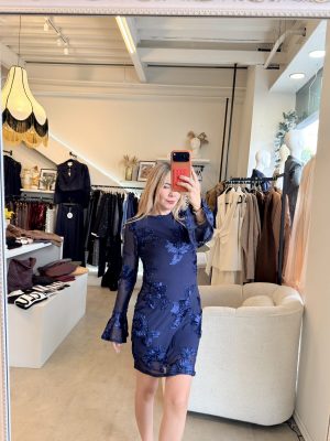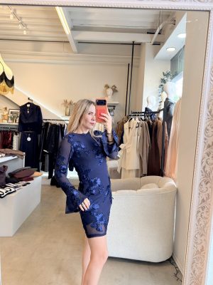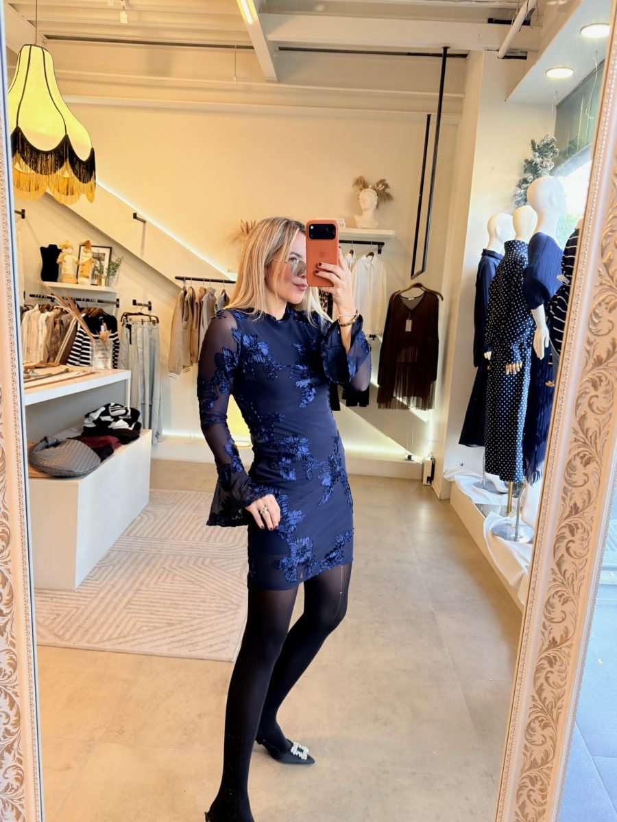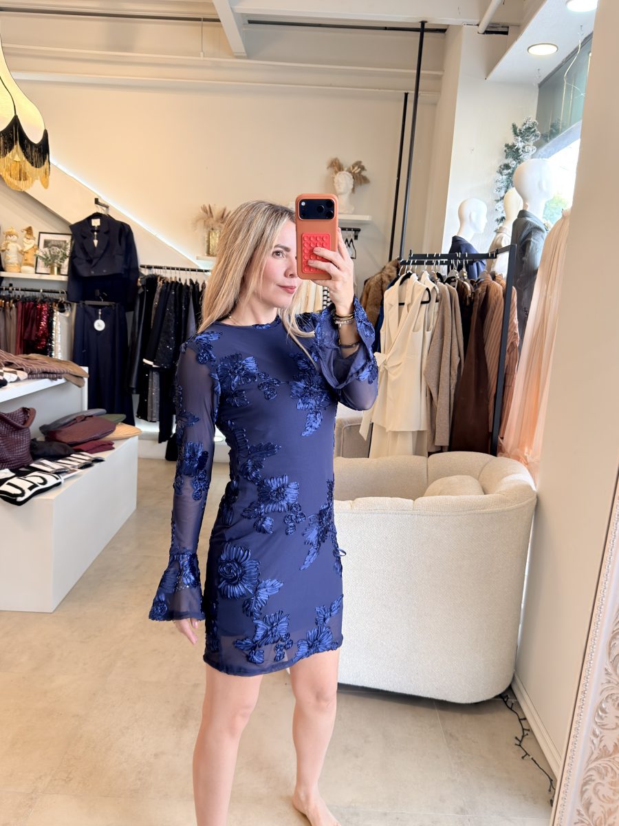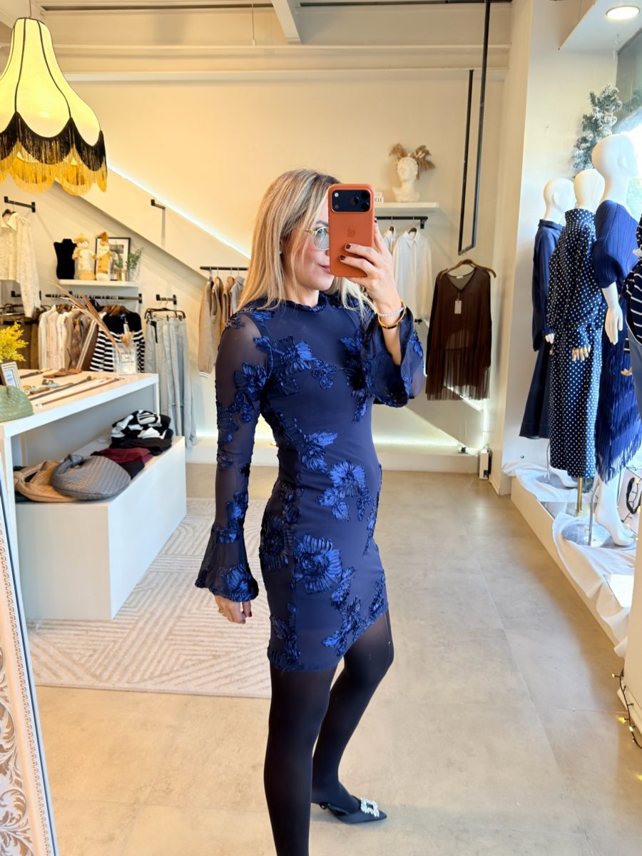Vestido corto manga larga bordado de flores en color azul