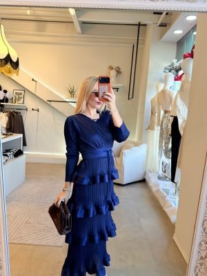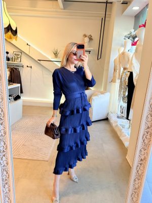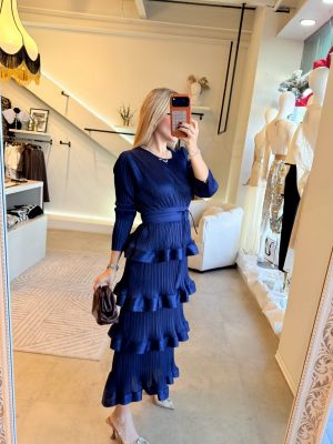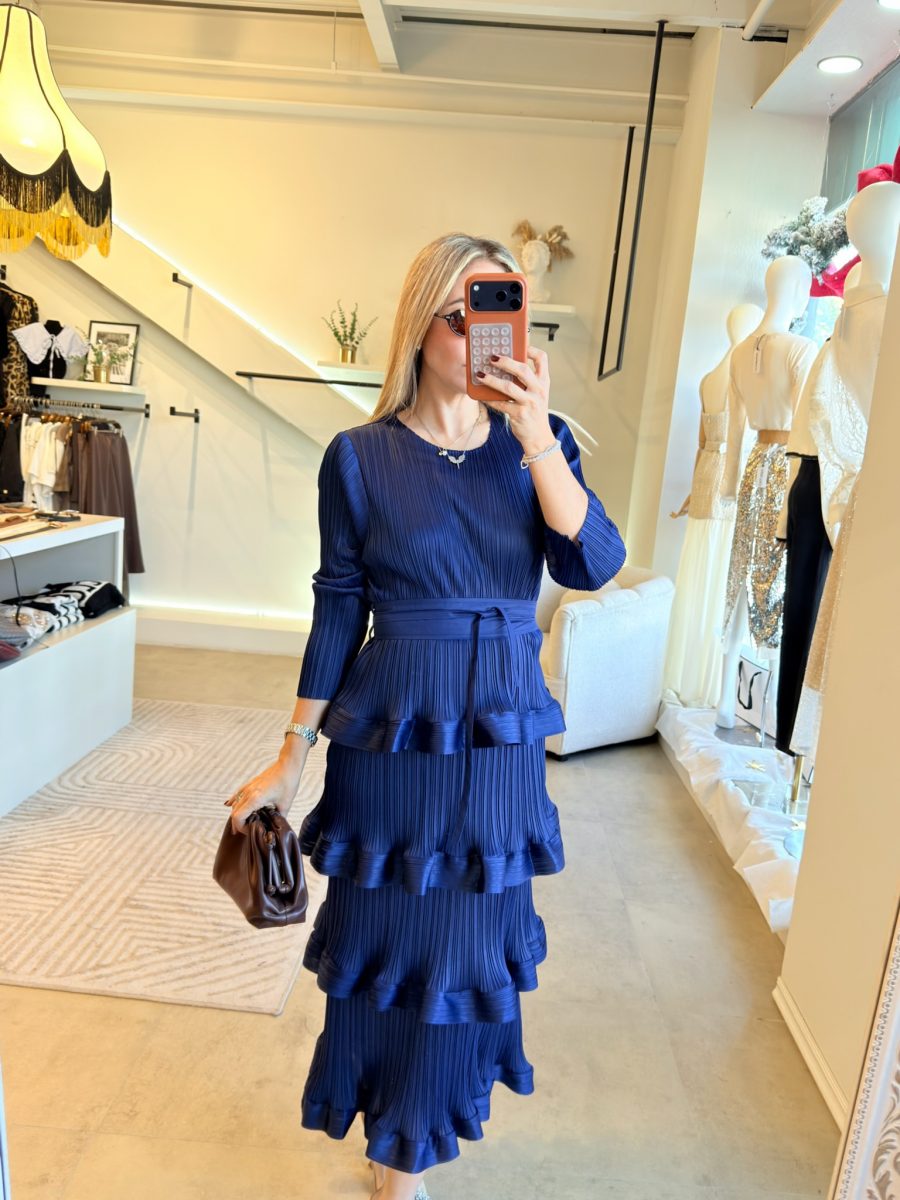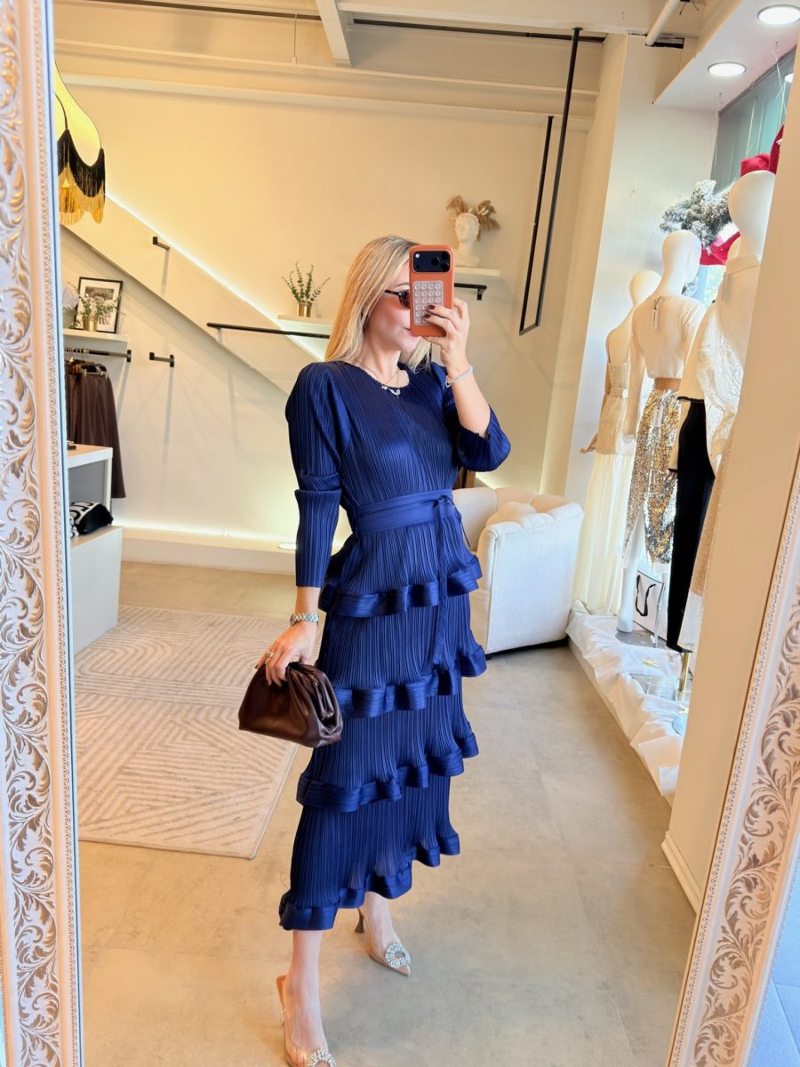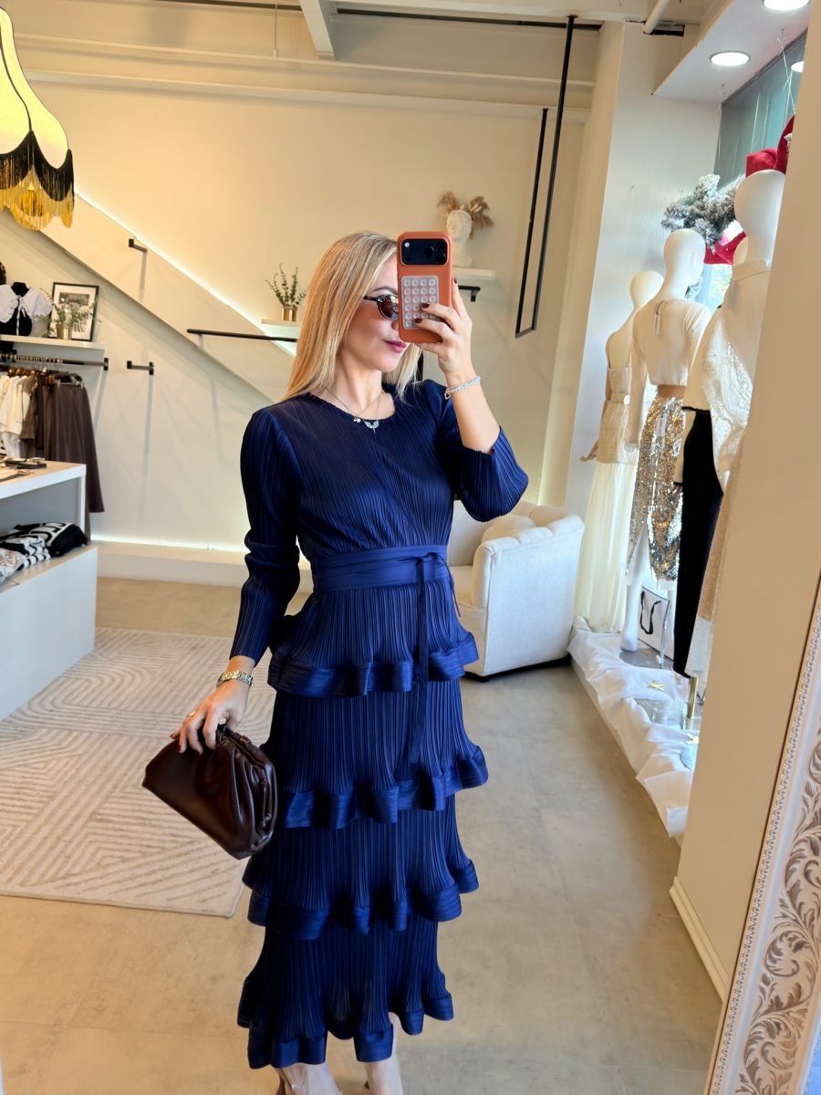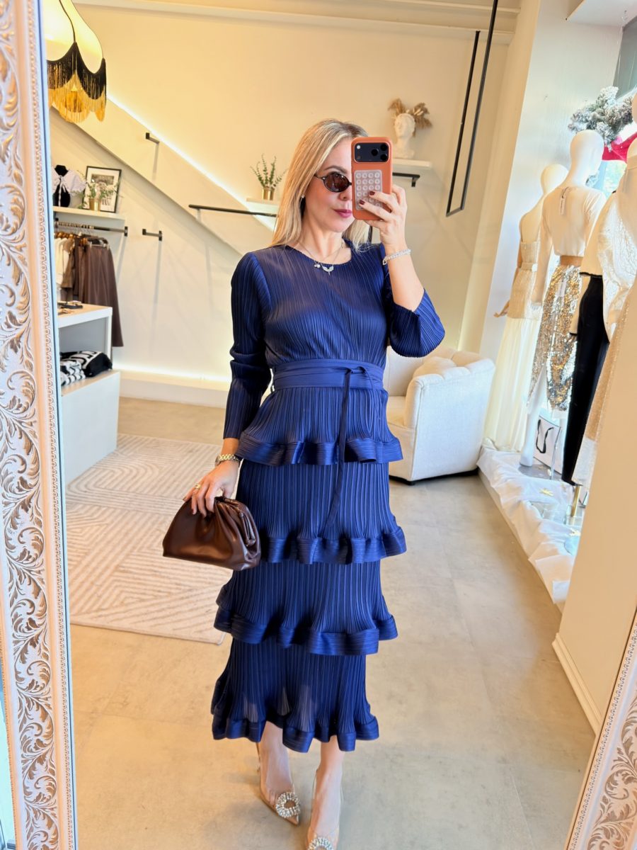 Vestido plisado manga larga con cinto y diseño de olanes en la parte de abajo color azul
