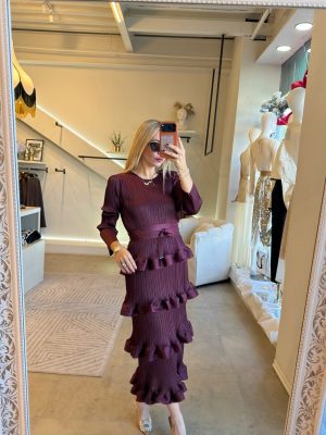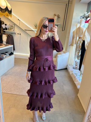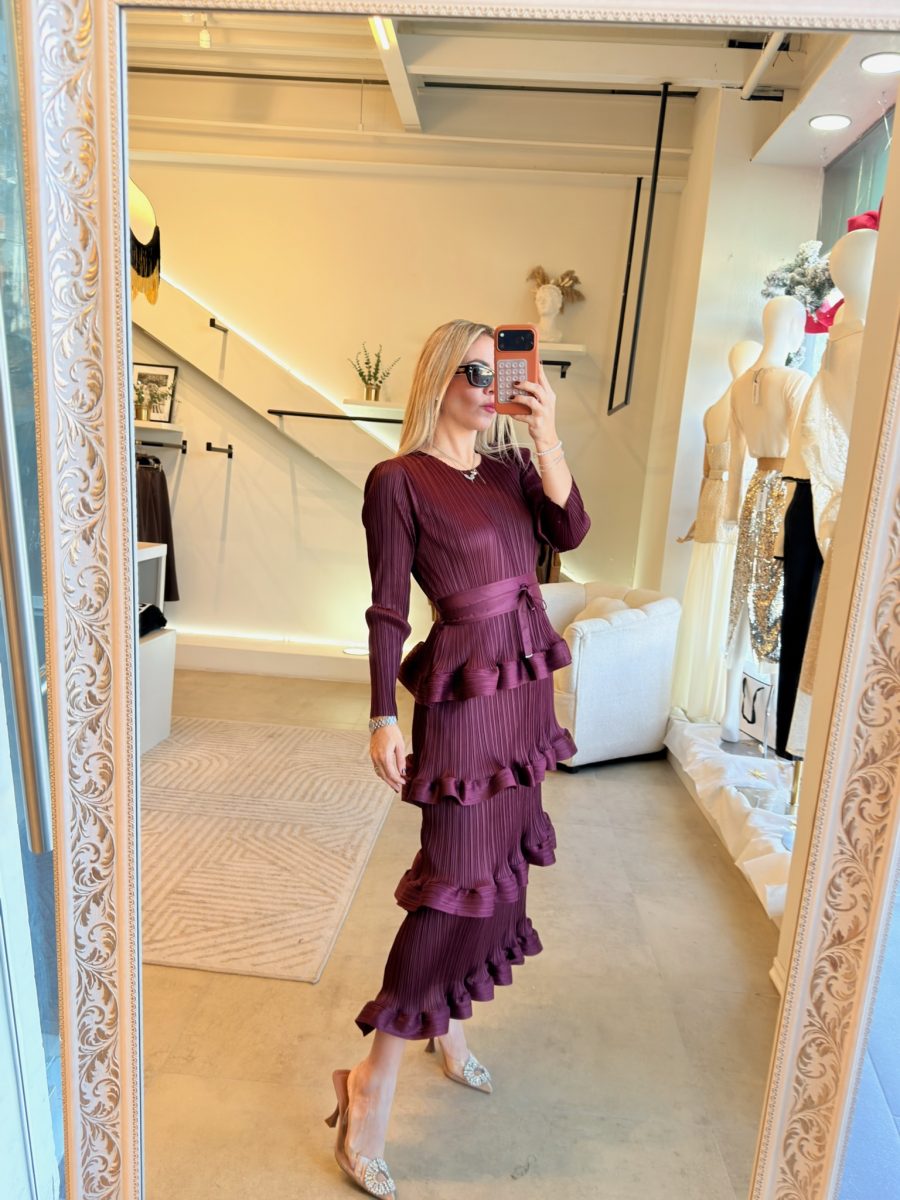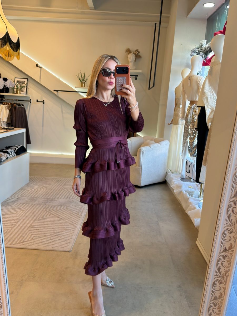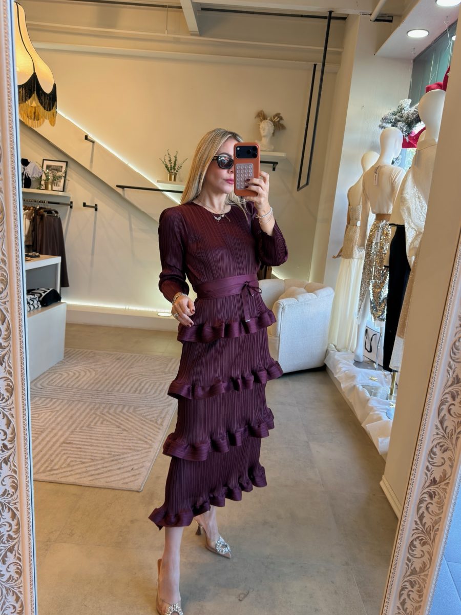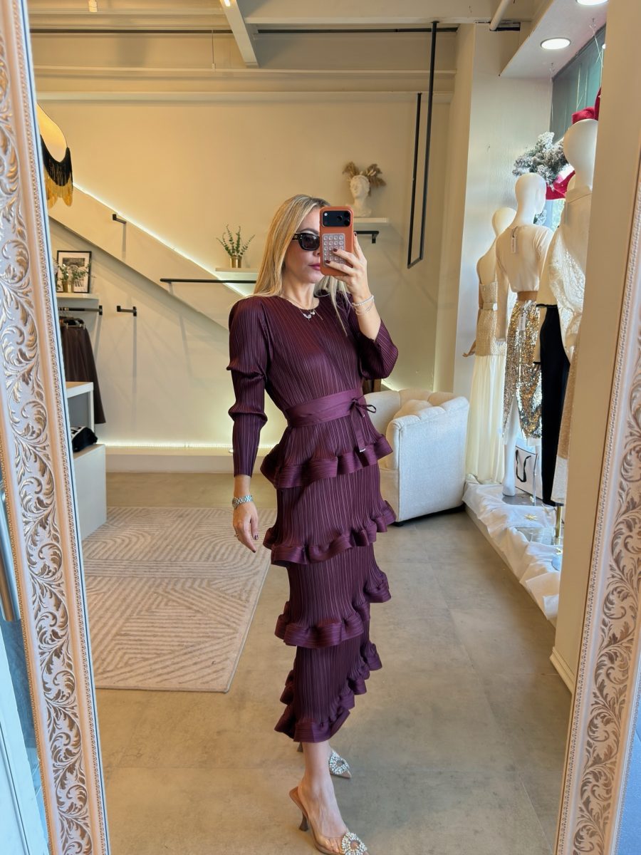 Vestido plisado manga larga con cinto y diseño de olanes en la parte de abajo.