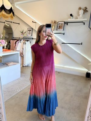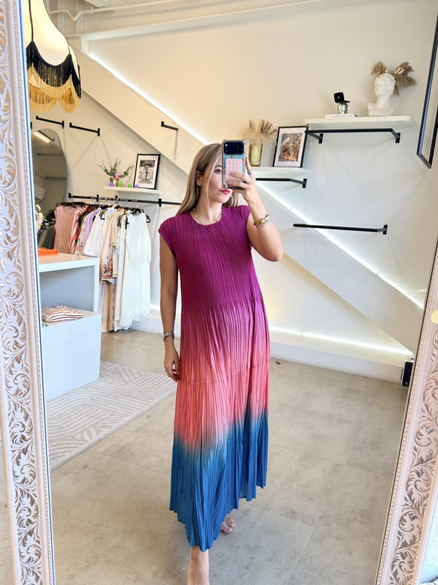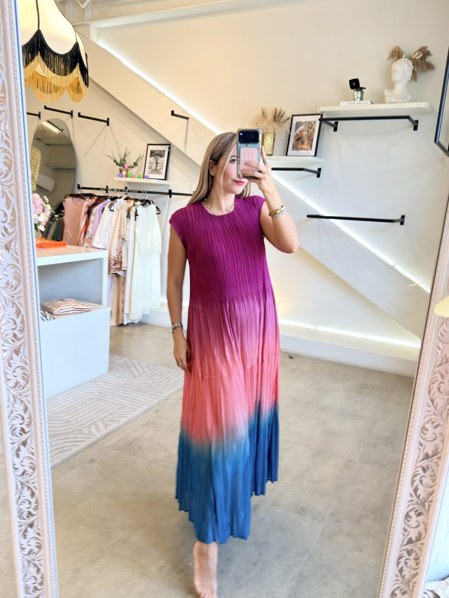 Vestido largo sin manga tela plisada colores deslavados rosa y azul
