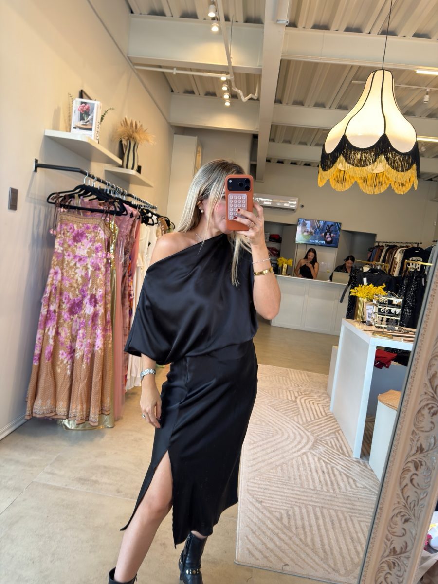 Vestido midi liso manga corta tela satinada con abertura en pierna izquierda color negro