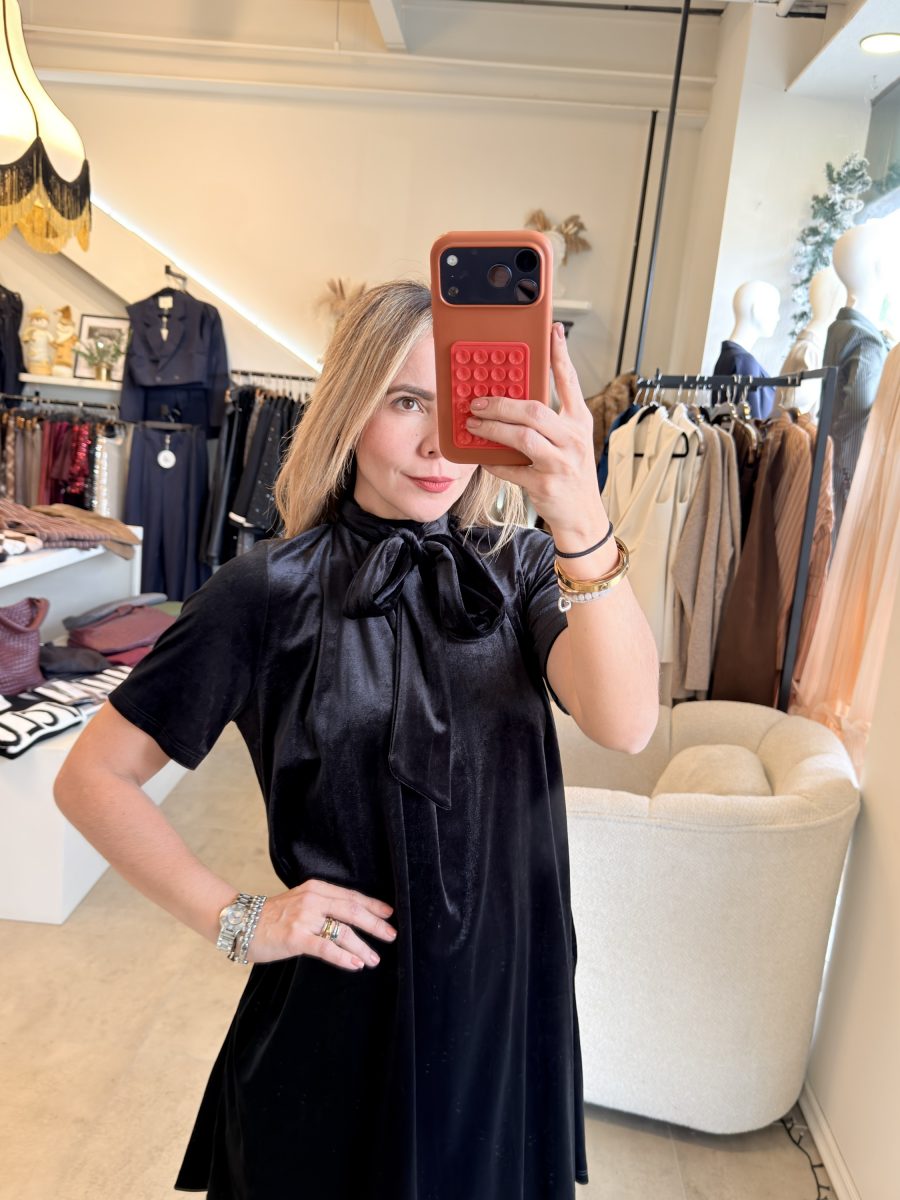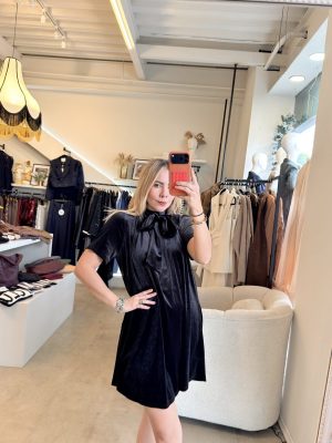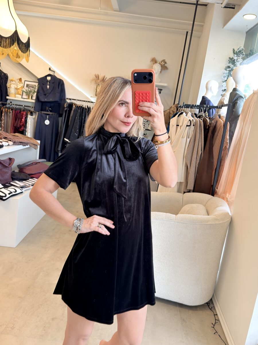 Vestido velvet color negro con listón en la parte de atrás.