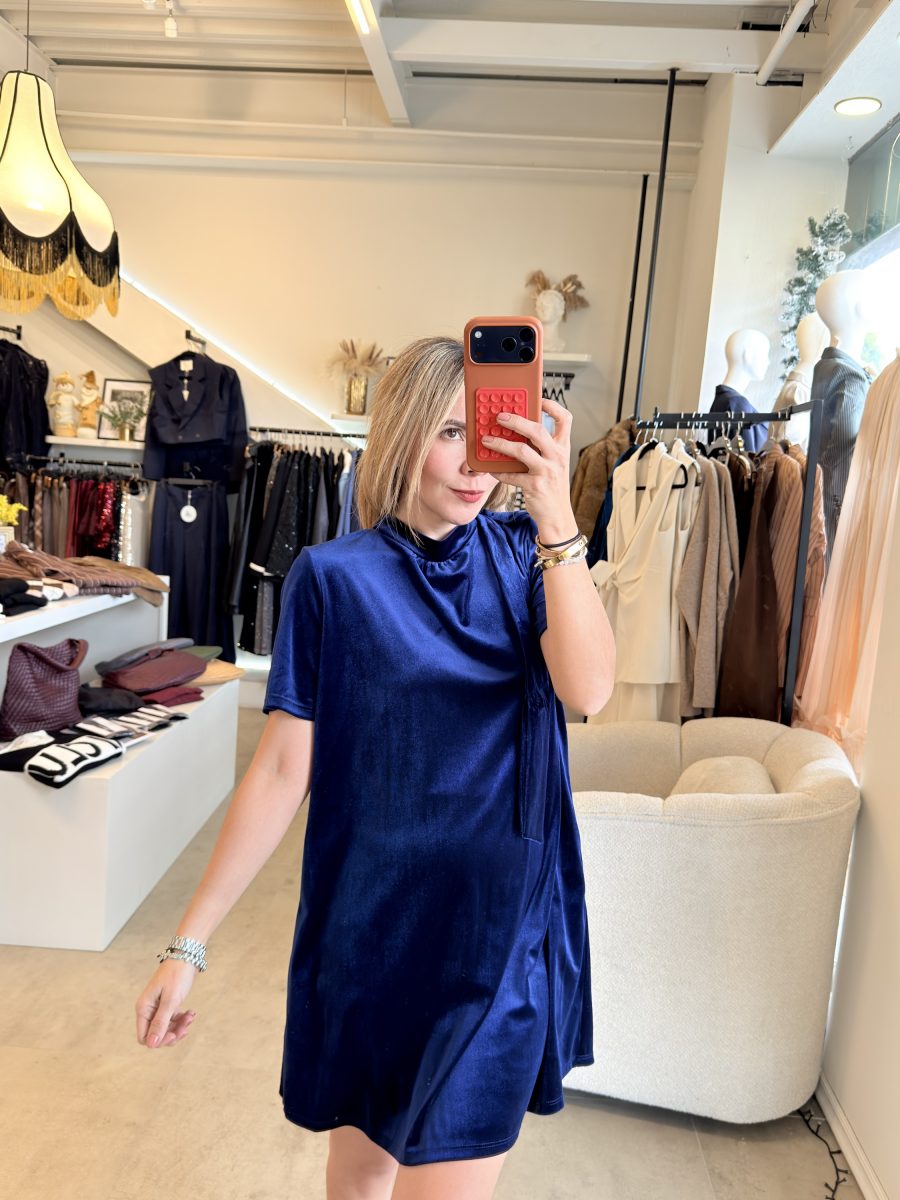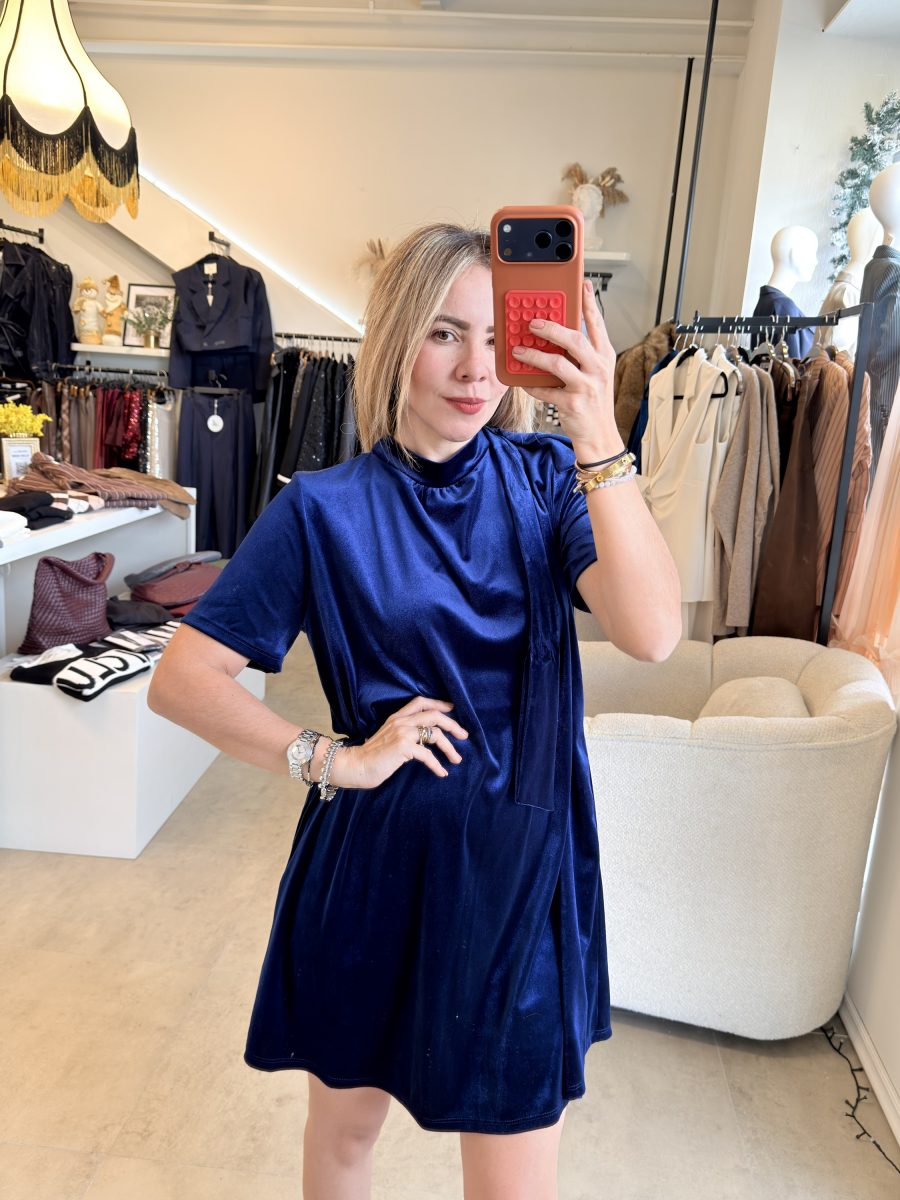 Vestido velvet color azul marino con listón en cuello