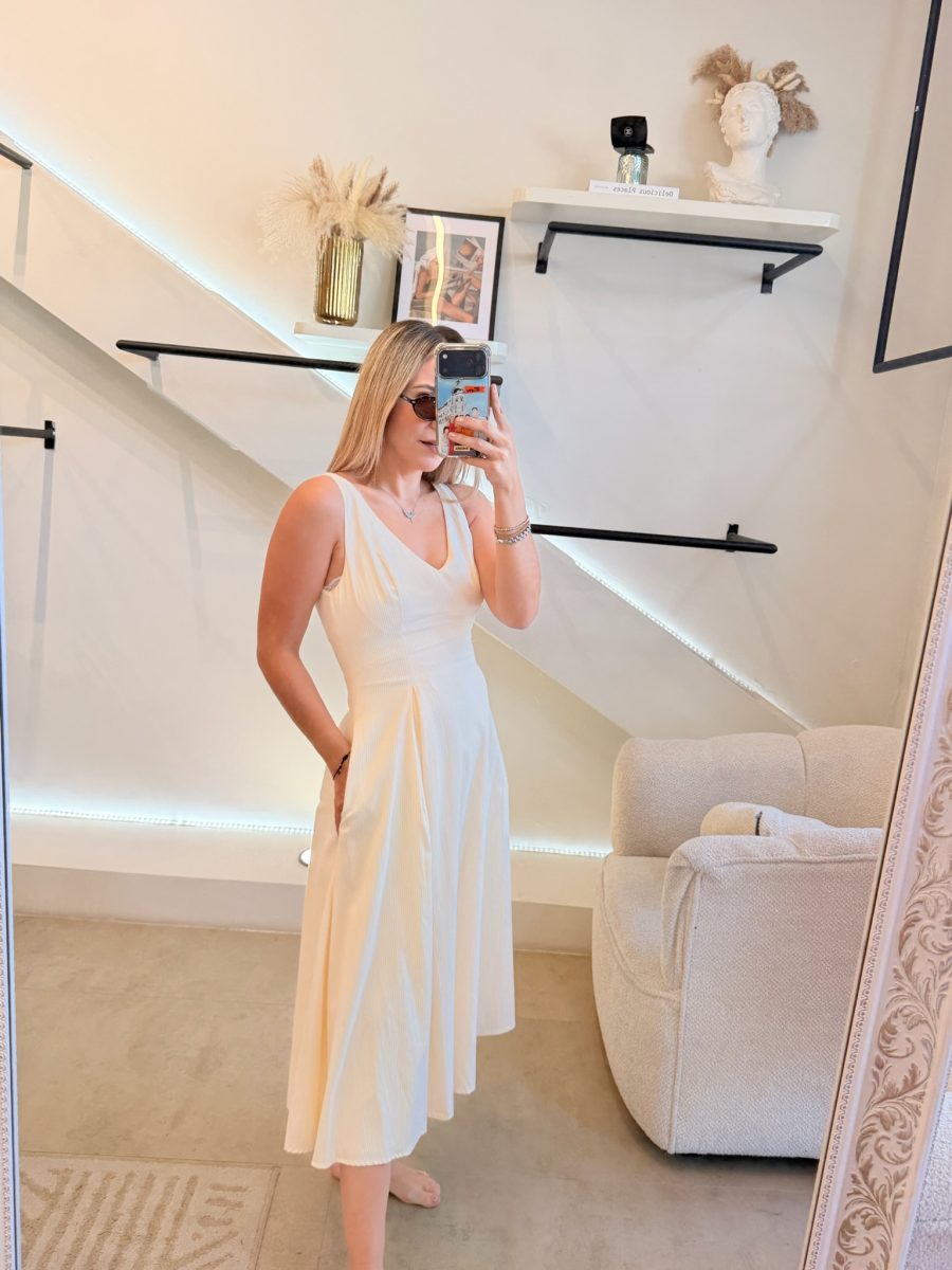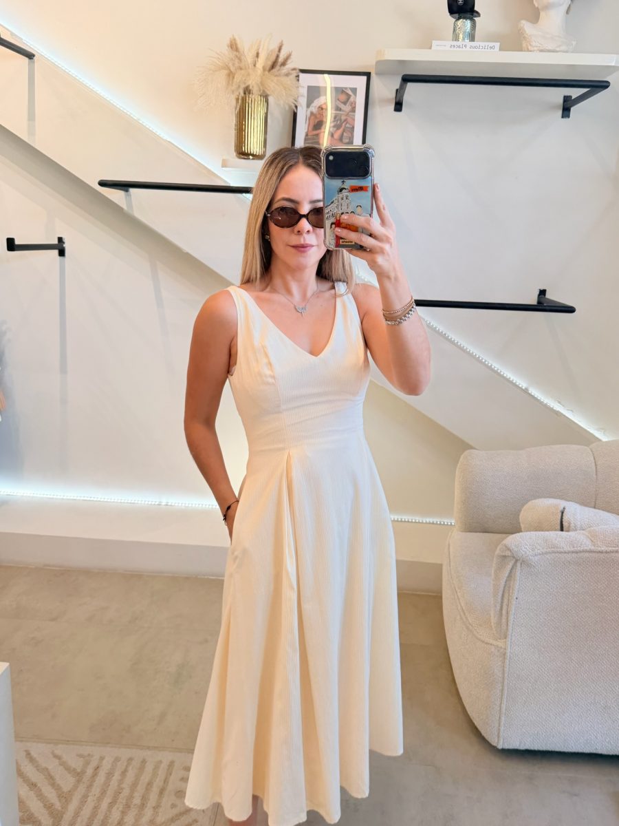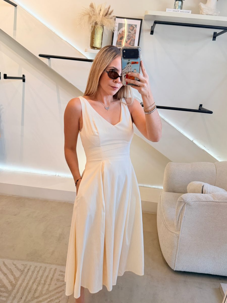 Vestido Midi tirantes con moño color amarillo con estampado de cuadrito pequeño color blanco
